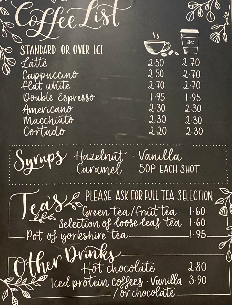 The drinks menu features an assortment of coffee styles such as latte, cappuccino, flat white, double espresso, americano, macchiato, and cortado. In addition to coffee, there are choices of green tea, loose leaf teas, Yorkshire tea served by the pot, hot chocolate, and iced protein coffees.
